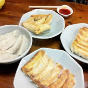 これは、みんみんというお店で、焼き餃子、揚げ餃子、水餃子を