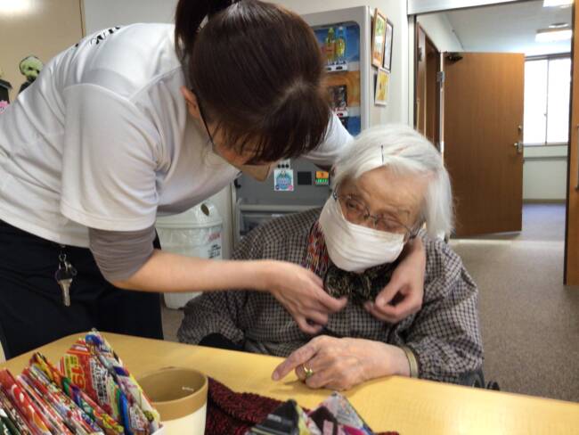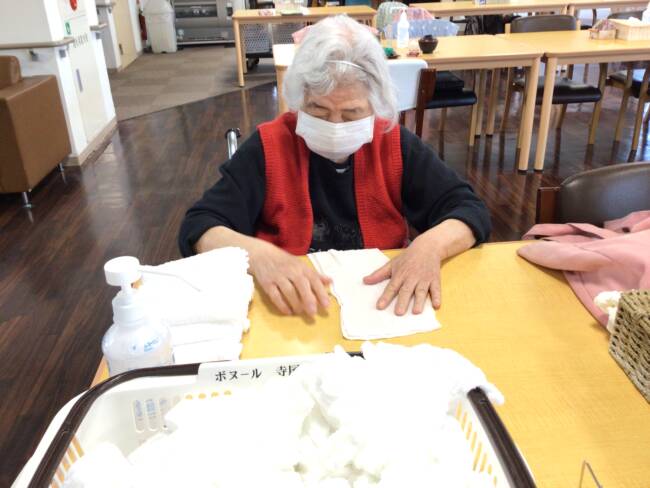 午後からは、おしぼりたたみをお手伝いしていただきました