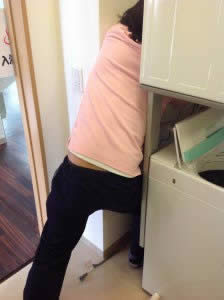 まずは施設長が・・・3階の洗濯機を1階に移動し1階での接続・・・・・かなり苦戦してます。(笑)