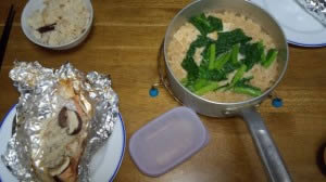 筍の 炊き込みご飯と、鮭のホイル焼き、それに、菜の花のぞうすい